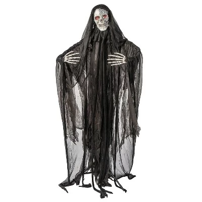 Skeleton Figure: Featuring a skull face with light-up red eyes and half bling, this animated standing figure is wearing a black, hooded cloak. Fright Night Thrills: The red eyes and malicious grin make this animated skeleton figure an eye-catching addition to Halloween displays. Level Up Party Backdrops: Include fearsome, glowing skeletons in your party backdrops to thrill guests and create the perfect scary photo opportunities. Animated Effects: Decorations that move, make eerie sounds or speak scary phrases enhance the ambiance for parties, events, front yard displays or haunted houses. Spine-tingling chills await your party guests, passersby and trick-or-treaters who see this animated skeleton in your display. The standing skeleton man features creepy red, light-up eyes, a half bling face, gruesome grin, bony skeleton hands and a long, black, hooded cloak. Elevate the fright factor for your haunted house setup, party decorations or front yard displays with this gruesome figure. Requires 3 AA batteries, included.