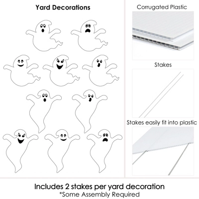 Outdoor Halloween Lawn Decorations Includes 10 coordinating Spooky Ghost yard decorations: 5 Short Ghost shapes and 5 Tall Ghost shapes; and 20 sturdy stakes for displaying. Perfect For Any Location! Spooky Ghost Yard Signs SIZE: Short Ghost 11 inches x 9 inches; Tall Ghost 10.5 inches x 13 inches. Vibrant White Spooky Ghost yard decor is an easy way to decorate for a Halloween party. Both adults and kids will love these Halloween party supplies. Display in front yards of your home, office or party venue. Easy to Use: Spooky Ghost Halloween Outdoor Lawn Decorations are professionally printed and cut, making assembly quick and easy. Simply insert two heavy-duty stakes into each Halloween yard ornament and press into the ground to display. High-Quality Yard Decorations: Ghost Shape Yard Signs are professionally printed on durable, corrugated plastic. 10-Piece yard decorations are waterproof and can be used outdoors. Halloween lawn decor can be displayed in wind, snow and rain without any worry. Made in the USA: Spooky Ghost – Ghost Shape Lawn Decoration Signs – Outdoor Halloween Yard Decorations are designed and manufactured at our Wisconsin facility using materials that are Made in the USA.