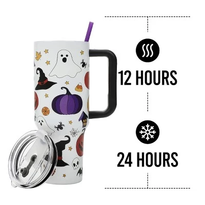 Add a touch of Halloween magic to your daily routine with this white 40 oz stainless steel tumbler featuring an all-over print of icons like ghosts, Jack-o’-lanterns, witch hats, purple pumpkins, and haunted houses. Designed to keep your beverages hot for 16 hours or cold for 24 hours, this tumbler is both practical and festive. Equipped with a handle, straw, and lid, it’s perfect for all your Halloween adventures. The tumbler is made with durable stainless steel and should be hand washed to preserve its design and quality.