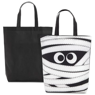 - Halloween Tote Bags for Kids: This set of reusable boo bags comes in a black and white mummy design that makes it a great choice for trick or treating on Halloween or everyday use