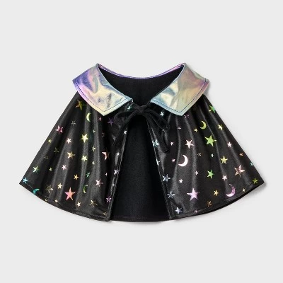 Dress your dog or cat up as the magical hero you know they are in this Cape Costume Night Sky Dog and Cat Costume Accessories from Boots & Barkley™. Made from polyester, this cape costume features a bright, iridescent collar and an allover iridescent design of moons and stars on a black background, making it excellent for a fun Halloween outfit or an imaginative dress-up occasion. The cape secures with a front tie closure and can be hand washed for easy care.