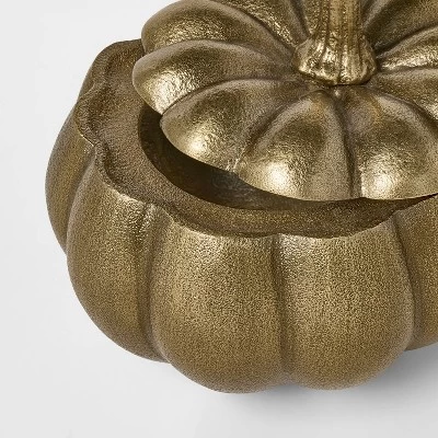 Whether it’s harvest or Halloween, add an antique style to your home decor with the Cast Metal Pumpkin Canister from Threshold™ designed with Studio McGee. Designed as a pumpkin, this canister has a lidded design to add to the look. This pumpkin canister is made of cast metal, making it a decorative accent piece on the tabletop.