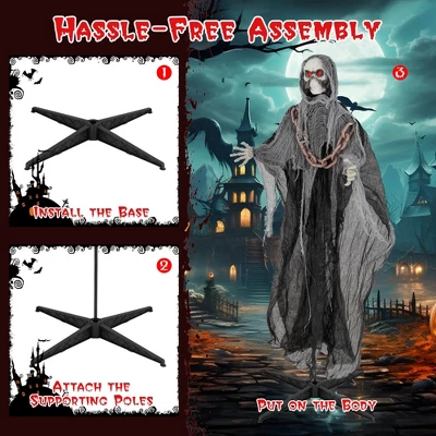 - Easy and Fast to Assemble: Easily assemble this Halloween animatronic prop with simple steps: install the base, attach the supporting poles, and put on the body. And then, the grim reaper is going to scare visitors in no time, making your home an attractive stop for trick-or-treaters.