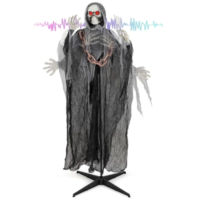 This animatronic skull ghost is equipped with flashing red eyes, creepy sounds, and automatic movements that will send shivers down your spine. Activated by sound, this ghost is easy to control and creates a haunting atmosphere. You can also customize its look with adjustable arms for different bloodcurdling poses. Dressed in tattered clothing and holding a heavy chain, this life-size grim reaper is perfect for your haunted house, garden, or yard, making a statement in any Halloween display. Setting up this bloodcurdling prop is simple, and it is sure to attract and impress trick-or-treaters for a truly memorable Halloween night.