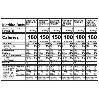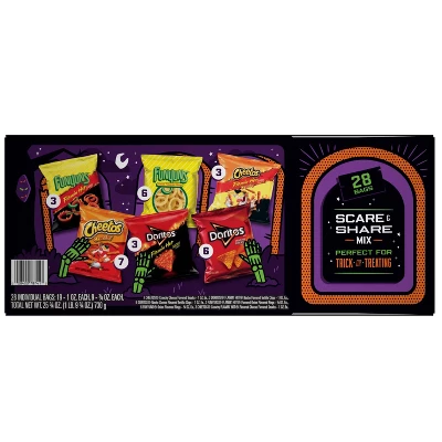 - 28 Coffin Variety Mix Includes: Funyuns Flamin Hot (3), Funyuns Onion Flavored Rings (6) Cheetos Flamin Hot Crunchy (3), Cheetos Crunchy (7), Doritos Flamin Hot Nacho (3) and Doritos Nacho Cheese (6)