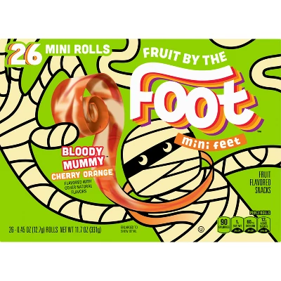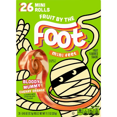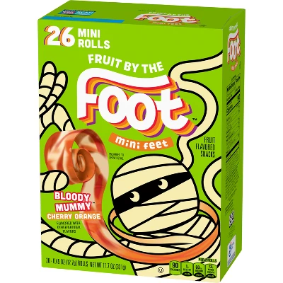 - FRUIT FLAVORED SNACKS: Unwrap delicious fun with Fruit by the Foot Mini Feet; Each tasty fruit flavored sheets strip packs a whole lot of Bloody Mummy Cherry Orange flavor and is rolled into a coil to create an exciting treat for the whole family