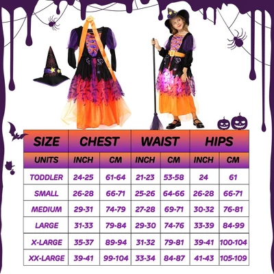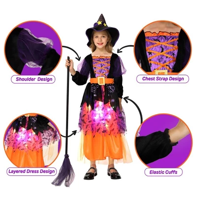 - 【Super Cute Witch Costume】Our halloween light up witch costume for girls includes 1 classic long witch hat and 1 light up dress with orange tulle layered. The witch costume include a glittery dress and a hat.Such a great holiday party costume.Nice and very elegant for a cute witch in the family(Broom doesn’t included!!!)