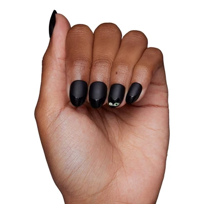 Give your nails the bewitching black cat treatment with the Nine Lives Nail Set. This short oval design features an matte black base with glossy tips, and adorable cat graphics for your very own magical companion this spooky season.