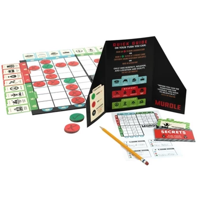- Includes 1 Logic Game Board, 100 Note Sheets, 4 Evidence Folders, 16 Evidence Cards (Tabbed), 16 Murdle Cards, 48 Tokens (12 âś“ Tokens, 36 X Tokens), 12 Discovery Cards, 3 Accusation Tokens, 4 Privacy Screens, and Complete Instructions