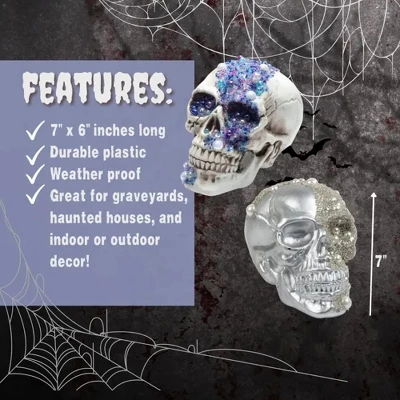 - Comes with one silver skull decorated with pearl colored accents and one white skull covered with multi colored purple, blue, white, and cobalt gems