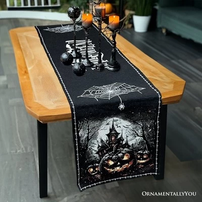 Welcome to a spine-tingling banquet where shadows dance and eerie whispers fill the air. This mesmerizing black table runner sets the scene with a chilling haunted mansion, sinister pumpkins glowing with malevolent grins, and a spider spinning its web under a ghostly moon. Perfect for those who revel in the macabre, this bewitching decoration promises to cast a spell on your Halloween festivities, turning any table into a realm of dark delights.