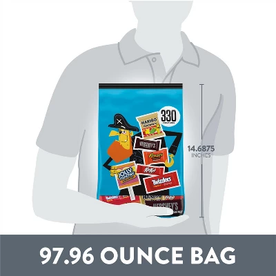 - Contains one (1) 97.96-ounce, 330-piece bulk variety bag of Hershey Assorted Milk Chocolate and Fruit Flavored Miniatures Candies