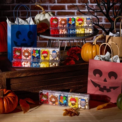 Illustrated with depictions of Harry, Hermione, Ron and Dumbledore, this 4 oz gift box is sure to charm any Harry Potter™ fan! It is filled with 5 flavors of Jelly Belly® jelly beans and we promise they are all good flavors. Flavors include Very Cherry, Tutti-Fruitti, Blueberry, Lemon and Toasted Marshmallow. This 5-flavor clear gift box makes a sweet gift for any Harry Potter fan!
