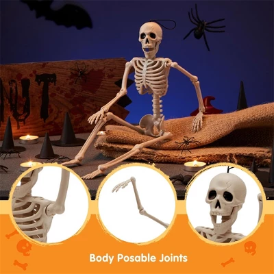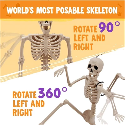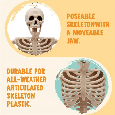 - Full Body Moveable Joint: The Halloween posable skeleton decor feature moveable limbs and jaw, allowing you to create custom poses and arrangements that suit your spooky vision. They will stay in place once positioned.This Halloween skeleton decoration will be a big hit at your Halloween party.