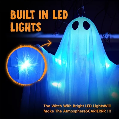 - 2-Pack Giant Light-Up Ghosts. Double the fright with two 47” flying ghosts featuring eerie warm white lights (batteries not included). Their realistic design and bendable arms allow lifelike floating or chasing poses.