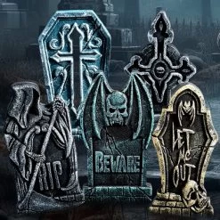 - 5-Piece Foam Tombstone Set – Includes five unique 17-inch gravestones with ultra-realistic aged stone designs for instant eerie atmosphere.