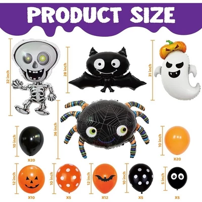 - Complete Halloween Balloon Kit. Get everything you need in one box – 75 latex balloons (multiple styles/sizes) plus 4 large foil balloons (bat, skeleton, spider & ghost), plus tape and glue dots. Perfect for car trunk decorations or indoor/outdoor Halloween setups.