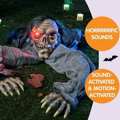 - Interactive Horror Effects. Motion sensors trigger a glowing red eye and bone-chilling groans when activated (requires 3 AAA batteries – not included). The sudden lights and sounds deliver jump scares that thrill trick-or-treaters.