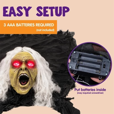 - Sound around this zombie within 20 inches will activate the creepy sound as its eyes flash, requires 3 AAA batteries (not included).