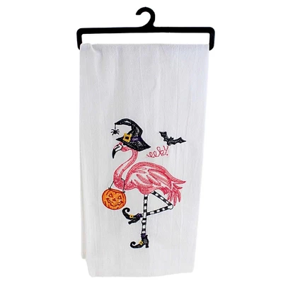 - Get into the spooky spirit with our Flamingo/Skeleton Hand Towel! This white towel features an embroidered skeleton and flamingo wearing witches hats, while a bat circles above. Hang it with ease using the included strap. Perfect for Halloween decorating and drying off after a long night of trick-or-treating.
