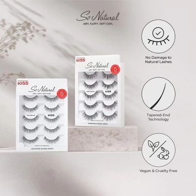 Lashes have never looked ‘So Natural’ than these new false eyelashes from KISS. Featuring our signature natural effect, these airy fluffy lashes deliver soft curl & lightweight comfort. Advanced tapered-end technology for a seamless, natural blend. Semi-matte finish mimics the look of real lashes—never plastic or shiny. Made with ultra-thin 0.05mm synthetic fibers for a delicate, fluffy effect. Get the perfect balance of softness and dimension in every 5-pair multipack.