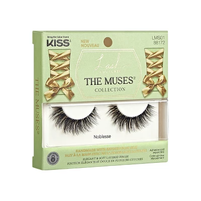 Inspired by the popular Royalcore aesthetic, The Muses Collection is soft and effortless, capturing the elegance and grace of classic times. Cruelty Free, contact lens friendly, and vegan. Perfect for any occasion, these lashes are fit for a queen! Each lash is handmade with innovative & refined faux-silk lash fibers, creating a light, pliable lash with a satin sheen and softer black color for ultimate naturalness. Works best with KISS Strip Lash Adhesive or GLUEliner (sold separately)