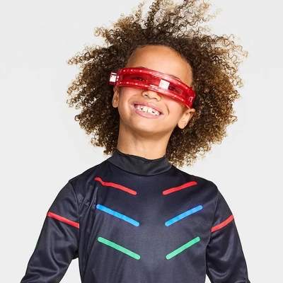 - Includes black jumpsuit with green, blue and red accents and red light-up visor glasses