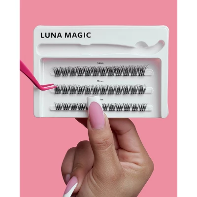Customize your lash look with Luna Magic’s pre glued Press On Cluster Lashes. This set includes 1 Lash Applicator and 30 pieces of Press On Cluster Lashes in sizes 10mm, 12mm and 14mm to create endless lash styles suitable to you! Each lash is coated with a pre-glued adhesive for an easy and mess free application.