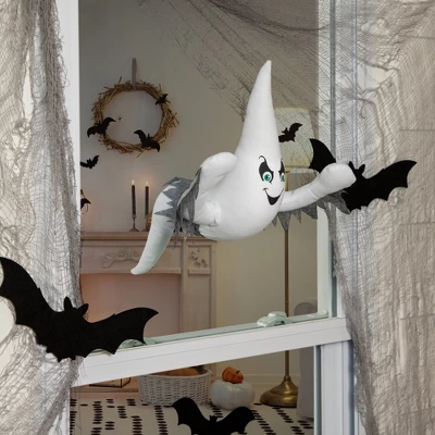 Skeletons, ghosts and ghouls, Oh My! Add this creepy ghost to your decor for a one of a kind statement piece. The body is placed in front of the window, while the tail is placed on the back of the window, lending a 3-D effect, as if it’s coming right through the window! Suction cups hold it securely to any smooth, flat surface. Features:3-D ghoulish ghost Halloween decorationLight weight and easy to install2″ suction cups hold the decoration securely to flat surfacesBendable wire in the armsFor indoor use or outdoor under a covered areaDimensions:Ghost: 12″H x 11″W x 6.5″DTail: 7″H x 8″W x 3″DMaterial(s): cotton/foam/fabric/plastic: