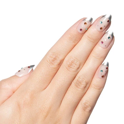 - A classic french mani accented by 3D puffy gems in a medium almond shape.