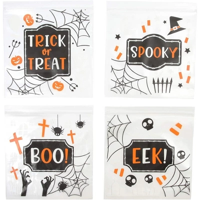- Halloween Resealable Bags: These bags feature a spooky theme and an opening slit on top to easily seal; the sealing zipper allows you to package candy and treats safely for travel