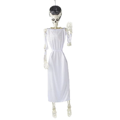 SKELETON THEME: This Halloween decoration is blacklight responsive and features a standing monster skeleton in a dress. ENHANCE THE HALLOW’S EVE MOOD WHEN YOU HOST EVENTS: Host Halloween-themed events, such as costume parties or movie nights, and use our bewitching home decor items to provide a memorable experience for guests. ELEVATE YOUR PORCH DECORATIONS: Transform your porch into an eerie space with seasonal decorations, setting the mood for the Halloween season. SCARY ENTRYWAY ACCENTS: Position skeletons near your home’s entrance to greet guests and trick-or-treaters with a scary touch. Product Description: Elegance from days gone by! Our 64″ Monster Skeleton is just the unique decoration to add to your next haunted scene! She features a natural bone-colored skeleton wearing a long white tunic with a corded tie belt and white fabric arm wraps down to her wrists. Increase the fear factor when you add a blacklight, as this prop is blacklight responsive! Product measures 15 1/2″ X 7 1/4″ X 64″.